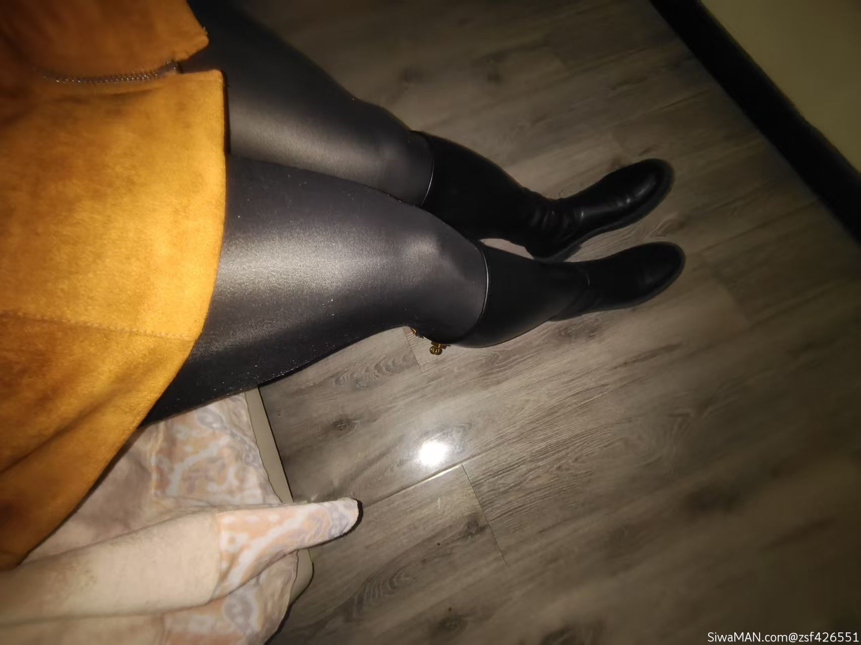短裙黑色亮丝加长靴