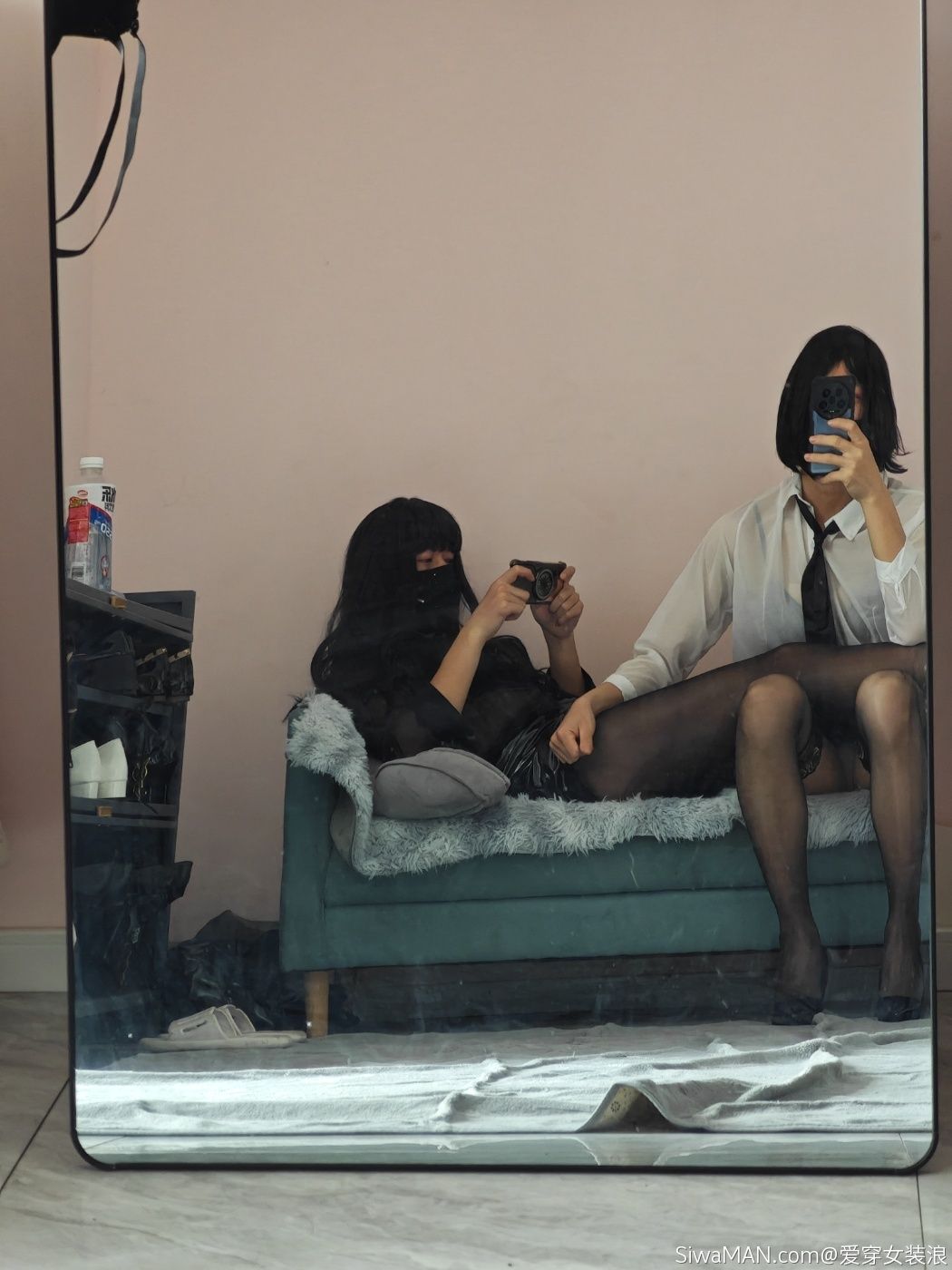 睡衣黑丝配裸色高跟鞋